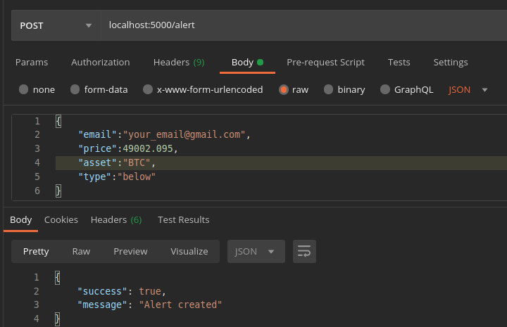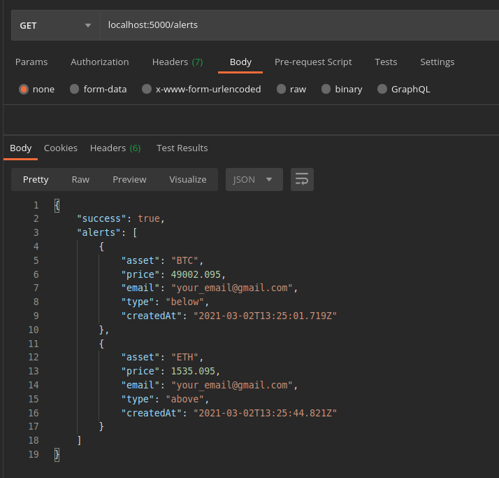 As I previously mentioned, this application is not suitable for production unless you make some more improvements like saving the alerts to a database, passing the keys as env variables, configuring process managers, and so on.,