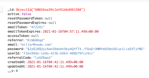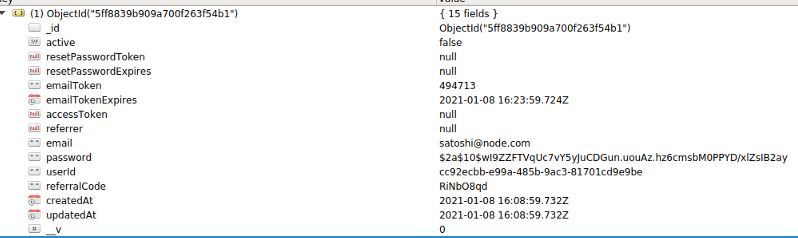 Cool! We got our referral code RiNb08qd . Let us take a look at our collection in DB.