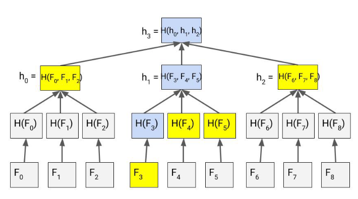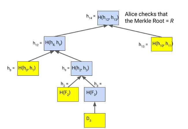 Consider Fig-2 as a file storage system, and we need to validate the file F3 returned by the file system (fs from now on) is valid. So in-order to compute the proof, the fs sends the following nodes along with the file F3.