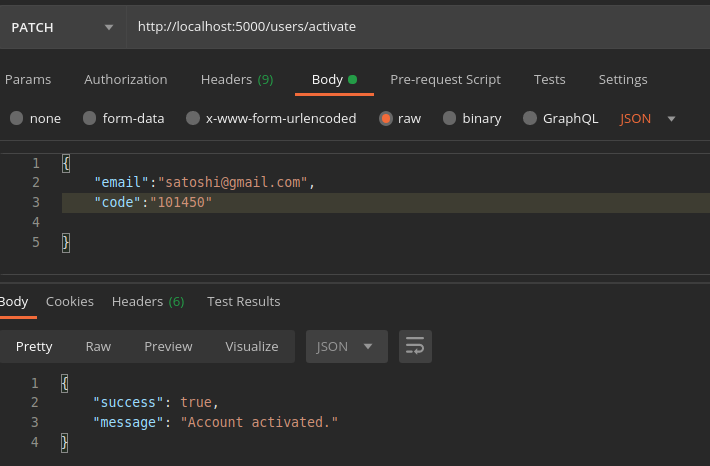 router.patch(“/activate”, cleanBody, AuthController.Activate)Save the file and restart the file. Lets try to activate our account.