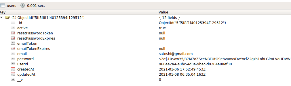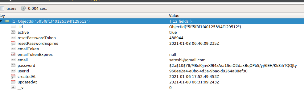 Yes! You can see that the resetPasswordToken and resetPasswordExpires have changed to “null,” the hash in the password field has also been updated.
