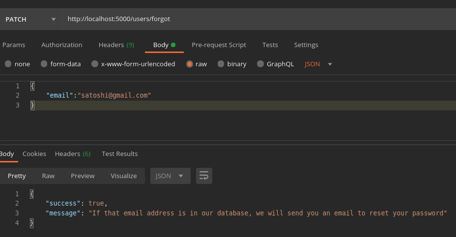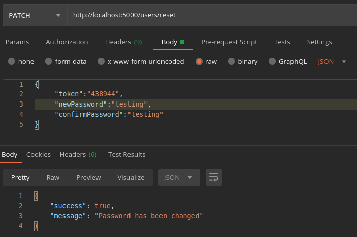 router.patch(“/reset”,cleanBody,AuthController.ResetPassword);Save the files, fire the server and switch to Postman.