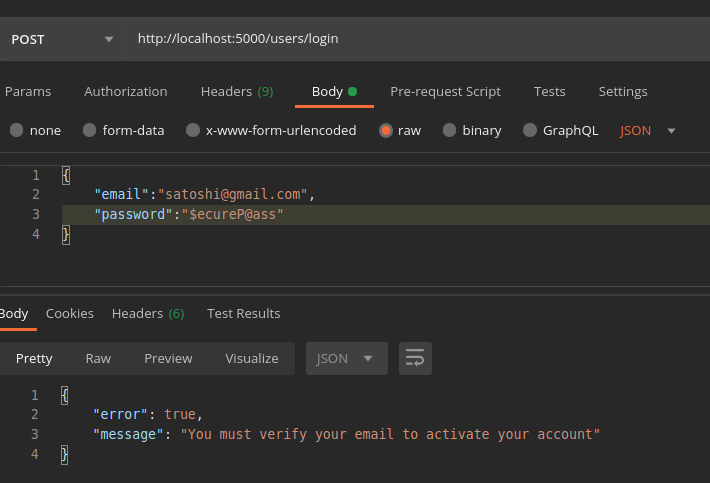 Oops! We get an error message from which we can infer that we cannot log in without activating the account via email verification. Let’s start building the logic for account activation. We will just get the email and the code (OTP sent to email during registration) from the user and verify whether it is valid.