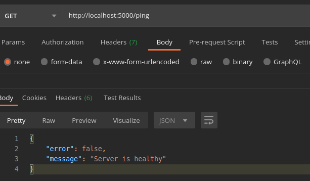Server started listening on PORT : 5000Now let’s test it by hitting the /ping endpoint from the Postman.
