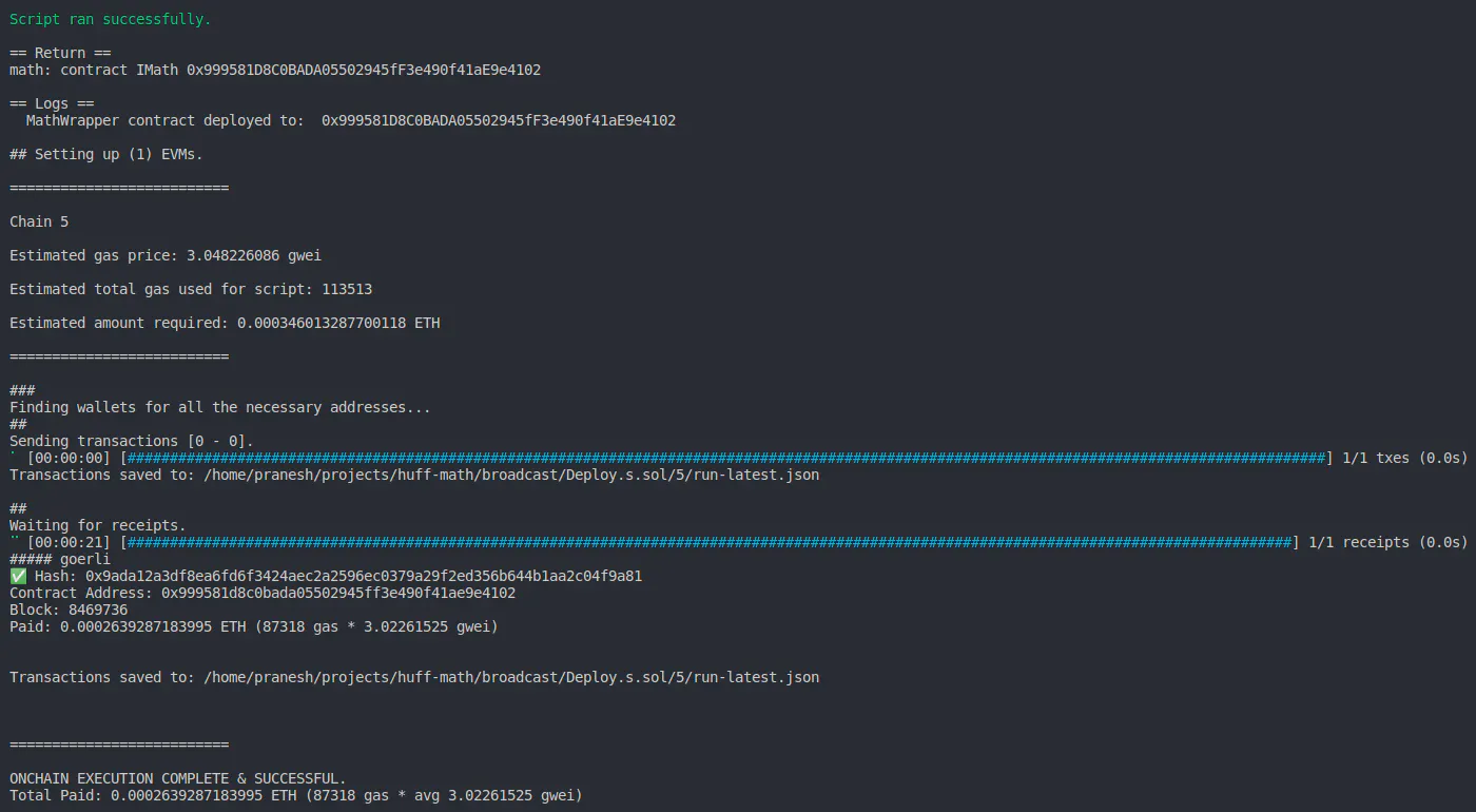 We just saw how to test Huff contracts using Foundry and Huff. Now we can move on to the next step which is deploying the Huff contract to a EVM-based blockchain (Goerli , in this case). Here’s the foundry script to deploy the MathWrapper contract.