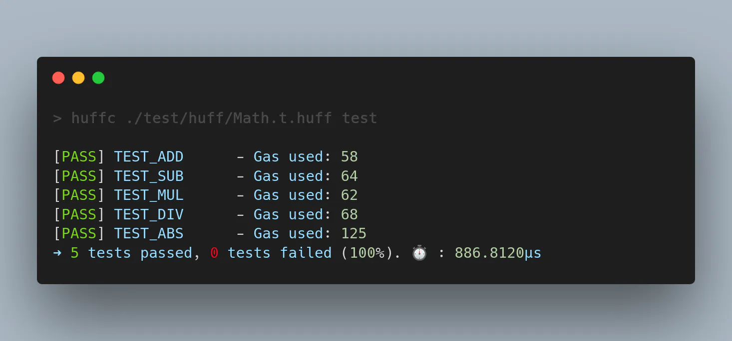 $ huffc ./test/Math.t.huff testThe output will be something similar to the below image: